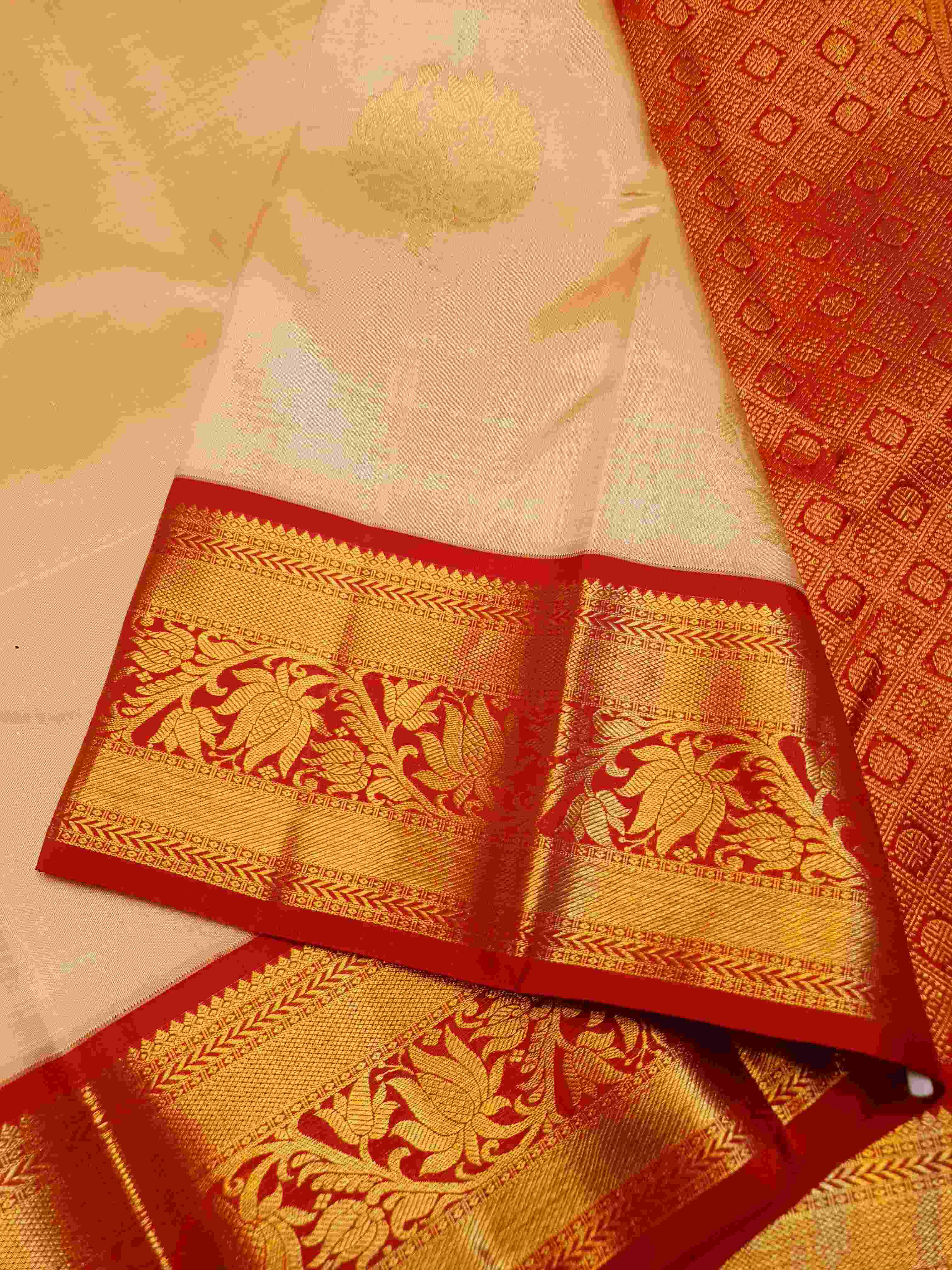 Beige And Red Kanchipuram Handloom 2G Gold Pattu Silk Saree