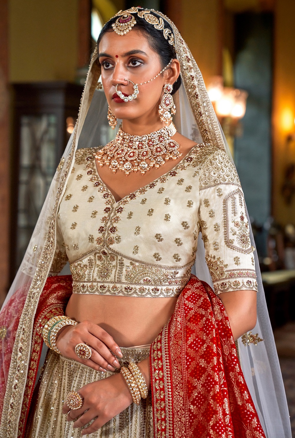 Beige Bridal Lehenga and Red Dupatta With Heavy Embroidery & Pearl Work