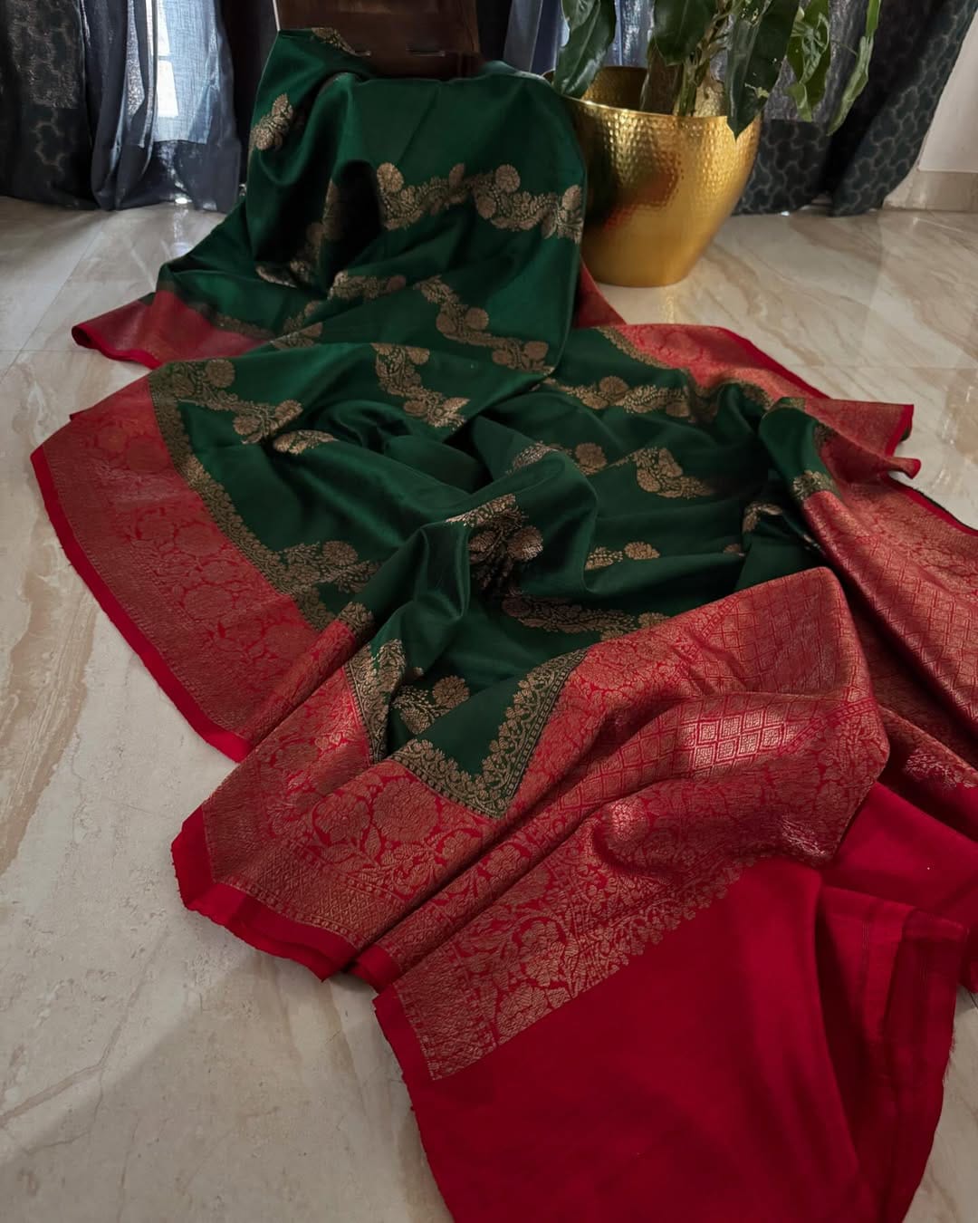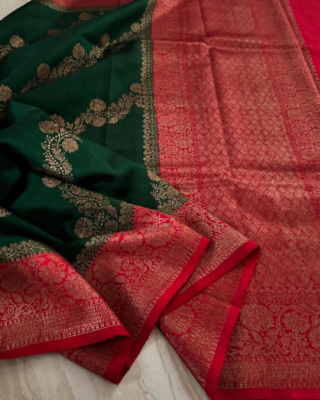 Bottle Green Banarasi Handloom Tussar Raw Silk Saree
