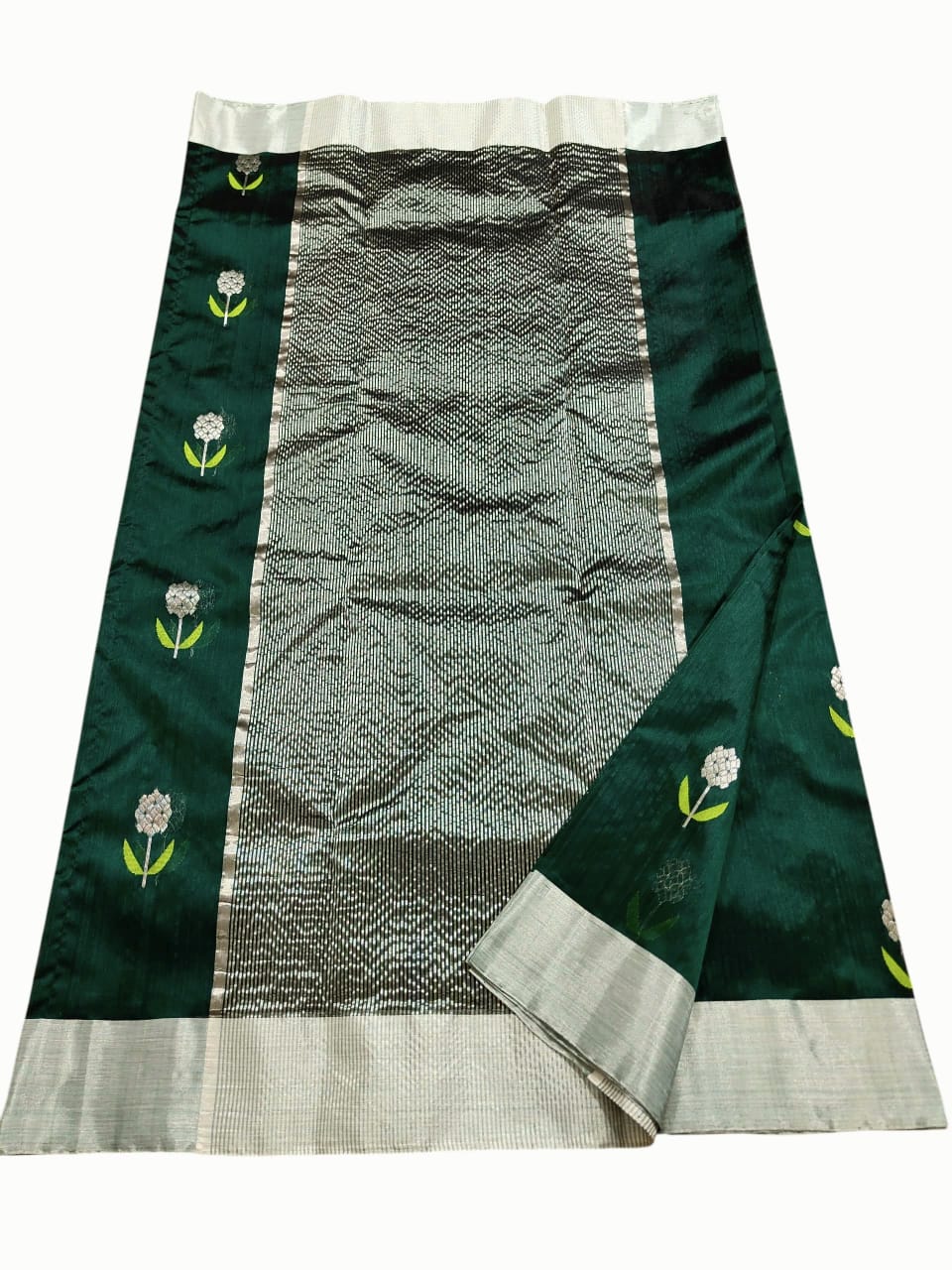 Bottle Green Chanderi Handloom Pattu Silk Handwork Saree