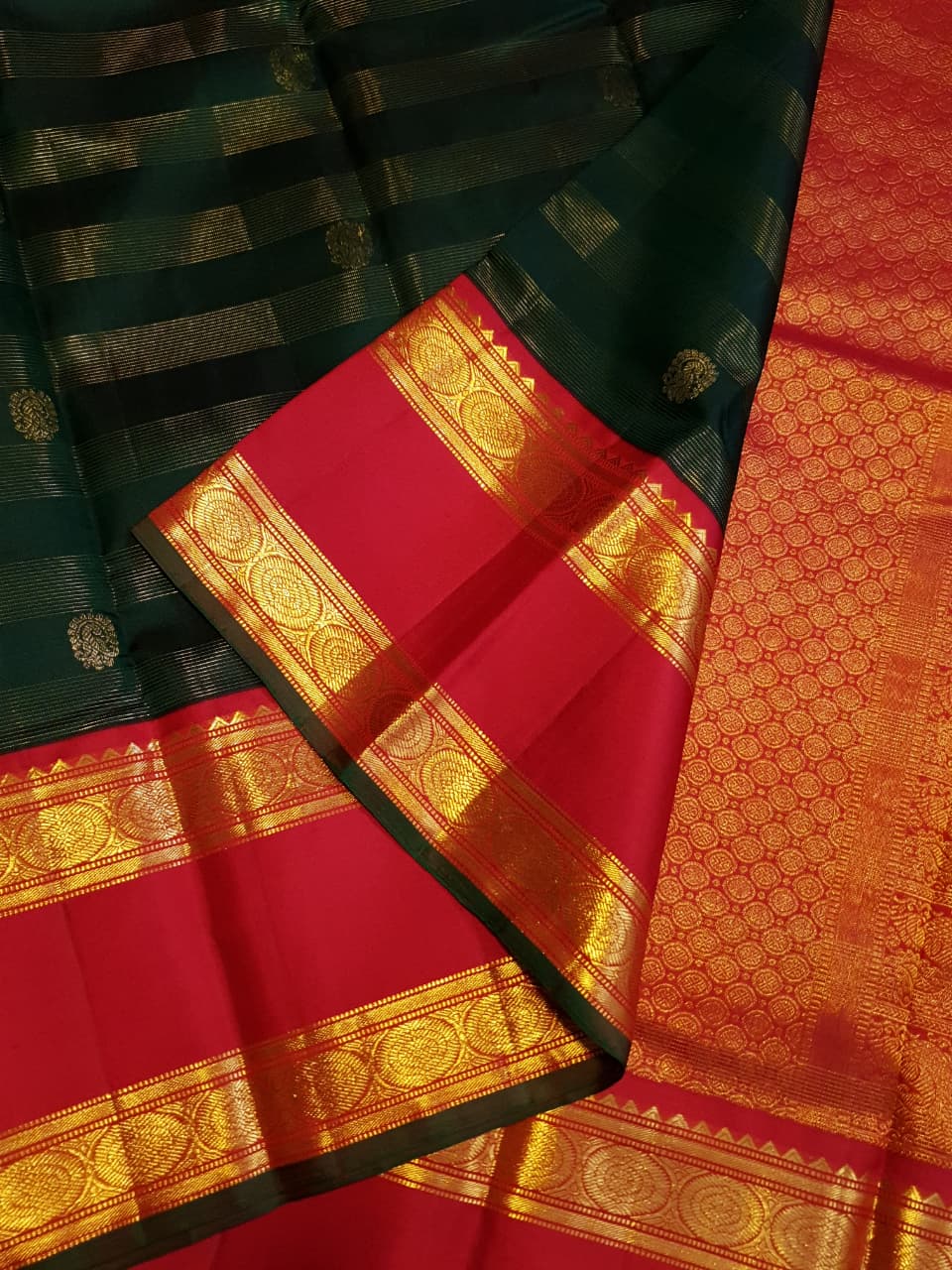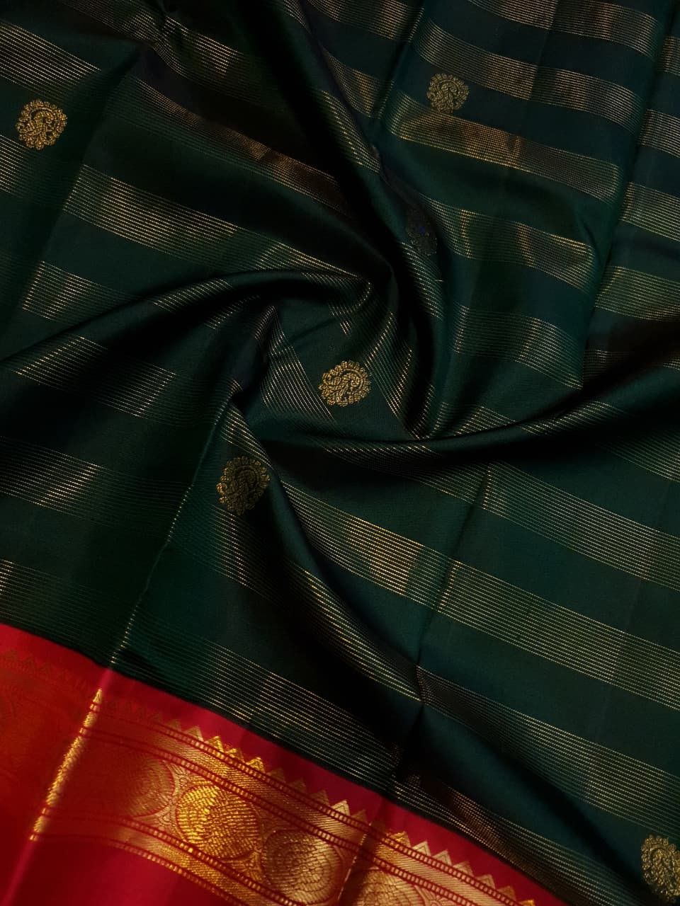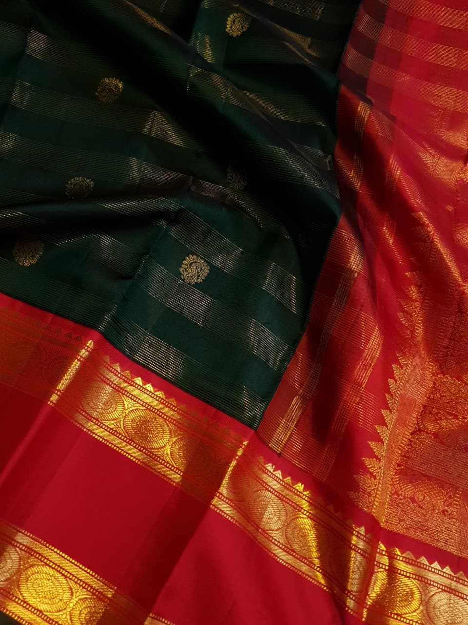 Bottle Green Kanchipuram Handloom 2G Gold Korvai Silk Saree