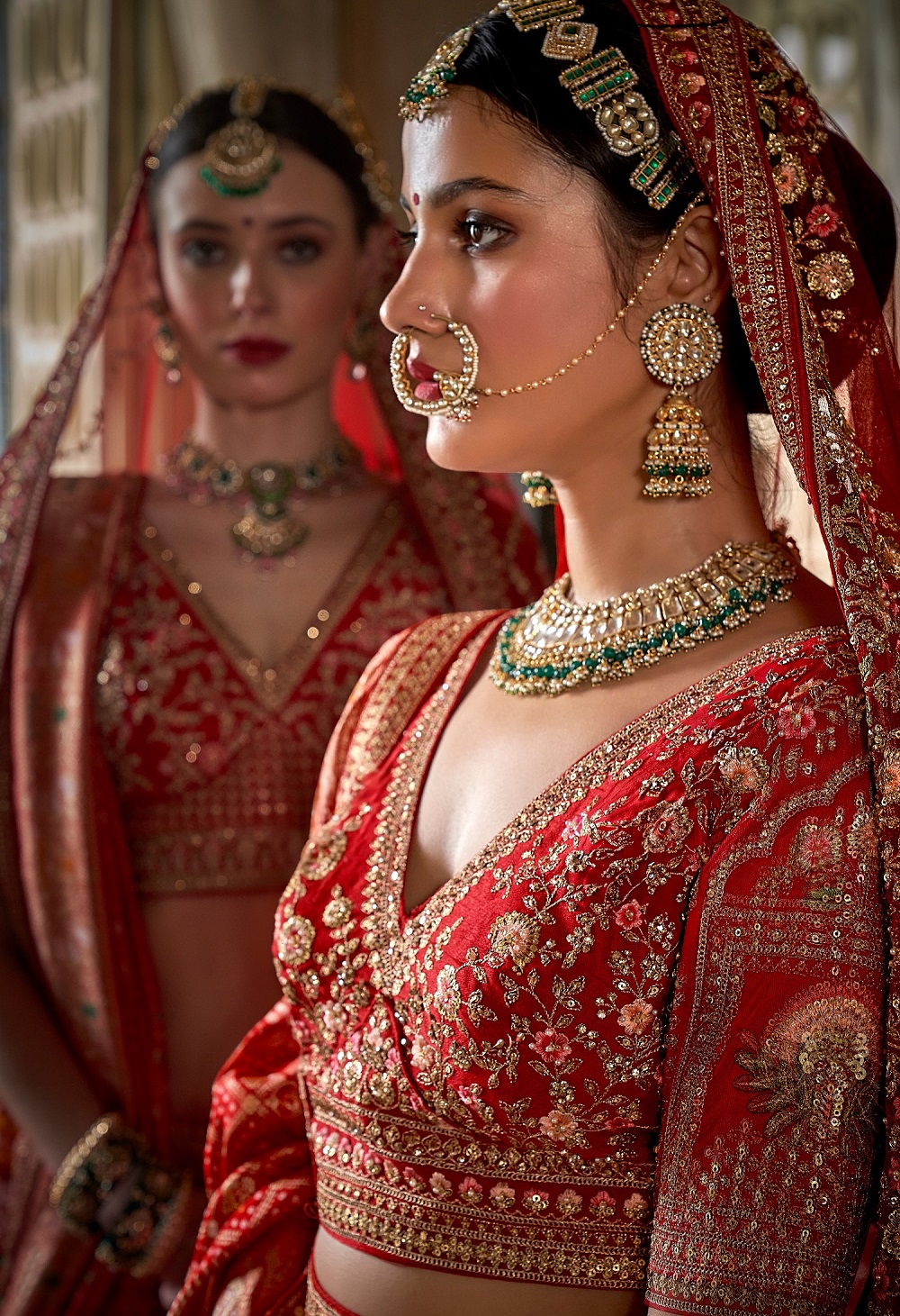 Explore our new Bridal Lehenga Collection in rich bridal tone silk, adorned with sequins, pearl, and zari embroidery. Paired with a matching blouse and dual dupattas—net and Banarasi—it’s perfect for an elegant bridal look.