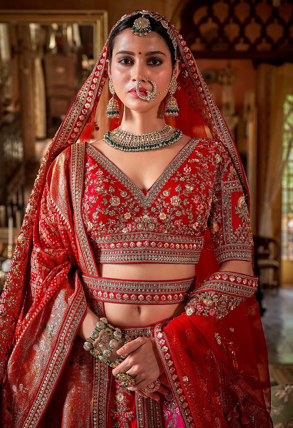 Bridal Red and Pink Heavy Embroidery & Pearl Work Lehenga