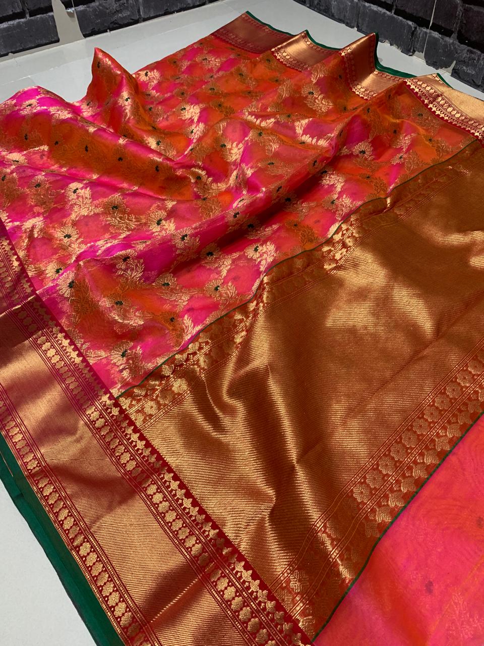 Gold Chanderi Handloom Katan Silk Meenakari Saree