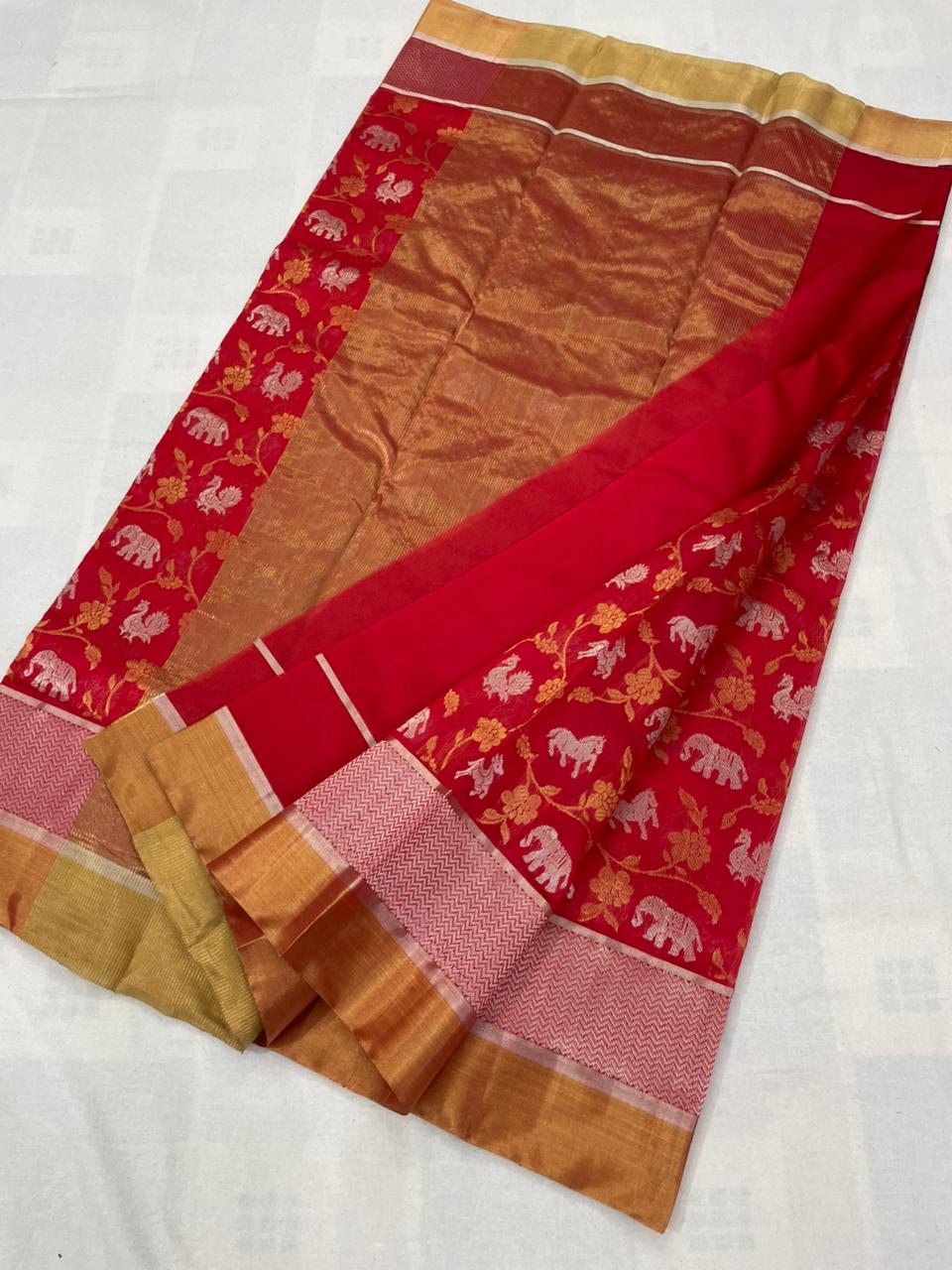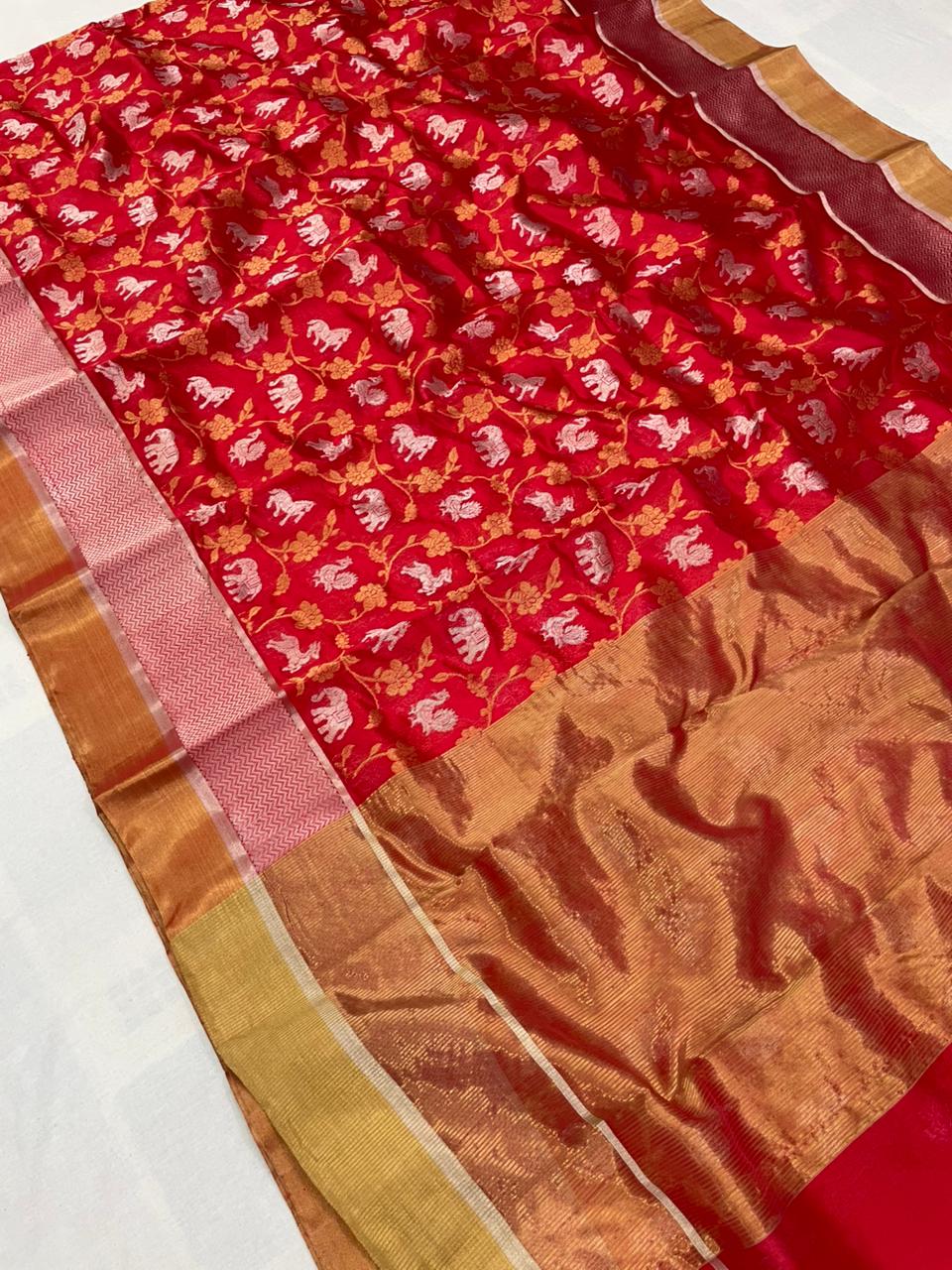 Chilly Red Chanderi Handloom Pattu Silk Shikargah Handwork Saree