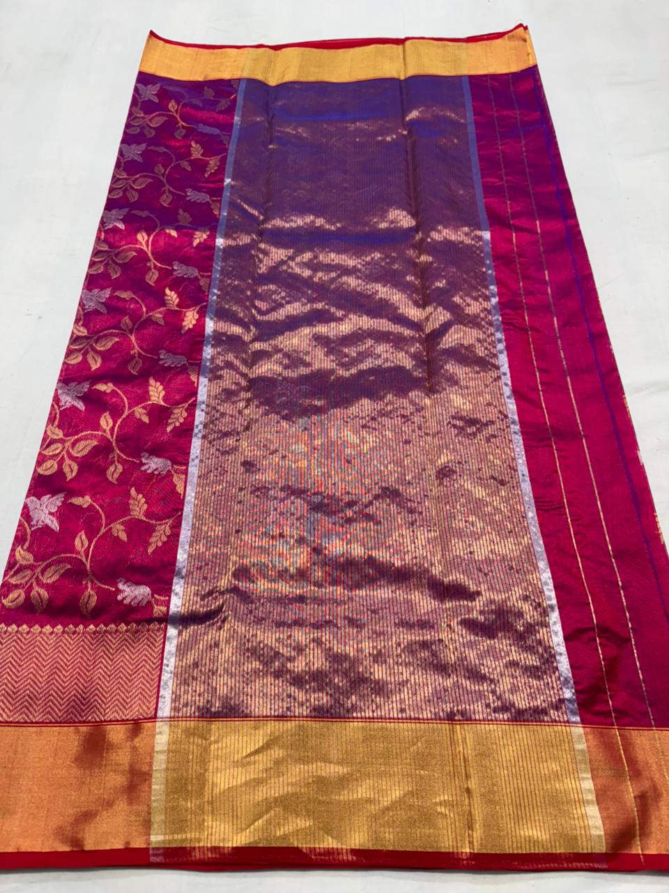 Dark Pink Chanderi Handloom Pattu Silk Shikargah Handwork Saree