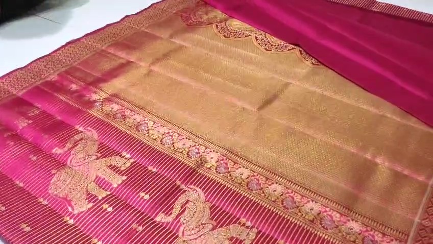 Gold and Hot Pink Kanchipuram Handloom Tissue Brocade Silk Saree