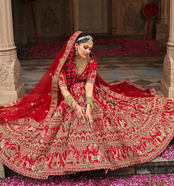 designer red bridal lehenga, khatli embroidery lehenga, double dupatta bridal outfit, luxury wedding lehenga, heavy embroidered bridal lehenga, red bridal couture