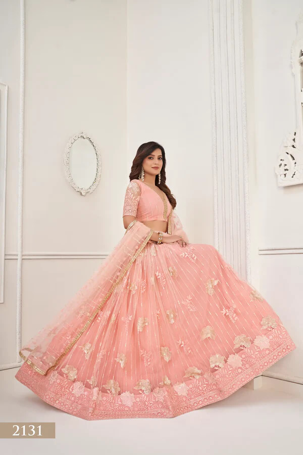 peach lehenga choli, net embroidered lehenga, cotton thread work lehenga, sequins net lehenga, designer peach lehenga, party wear net lehenga, bridal lehenga choli, festive net lehenga