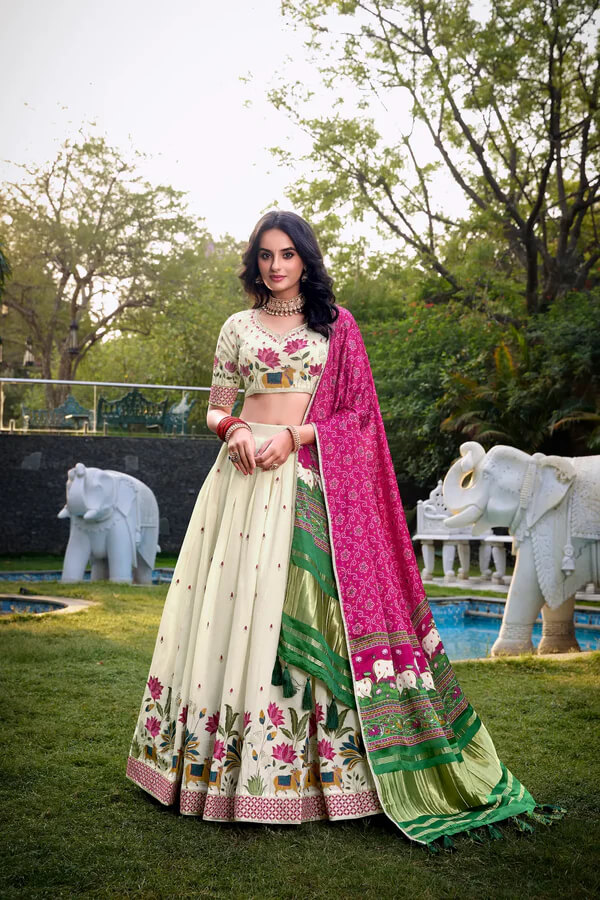 Ethnic Off White Lehenga Choli with Gaji Silk Hot Pink Dupatta