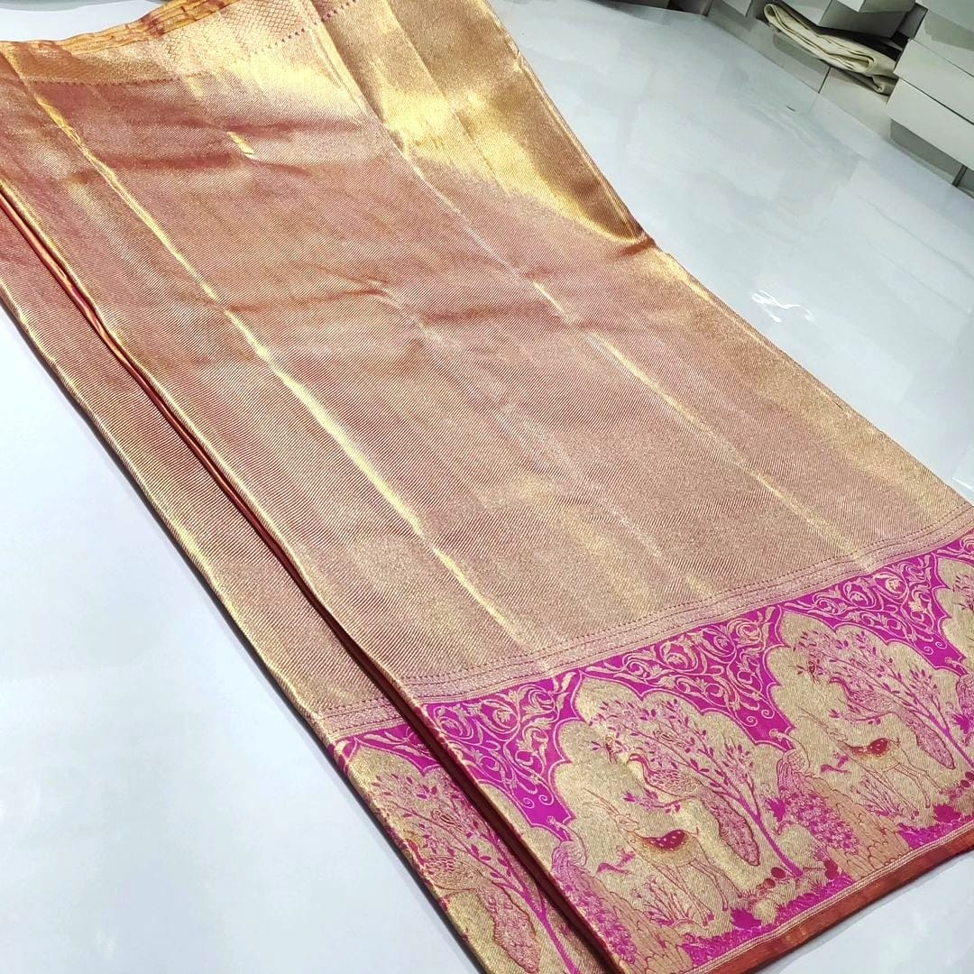 Gold & Hot Pink Kanchipuram Handloom Tissue Brocade Meenakari Silk Saree