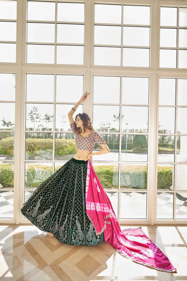 green lehenga choli, georgette green lehenga, thread embroidery lehenga, sequence work lehenga, designer green lehenga, bridal green lehenga, festive green lehenga, embroidered georgette lehenga