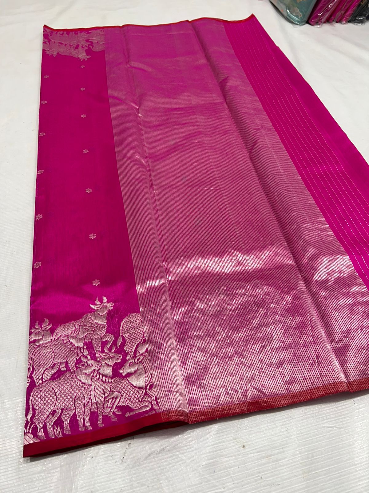 Hot Pink Chanderi Handloom Pattu Silk Meenakari Nakshi Saree