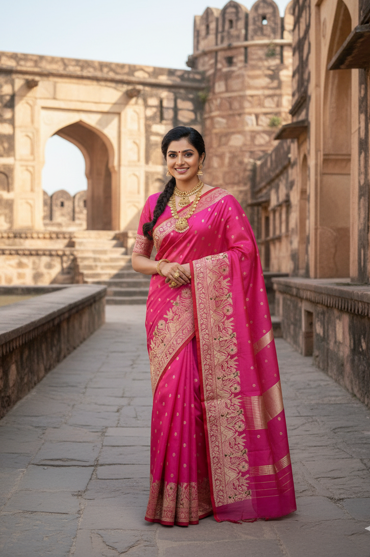 Hot Pink Chanderi Handloom Pattu Silk Brocade Saree