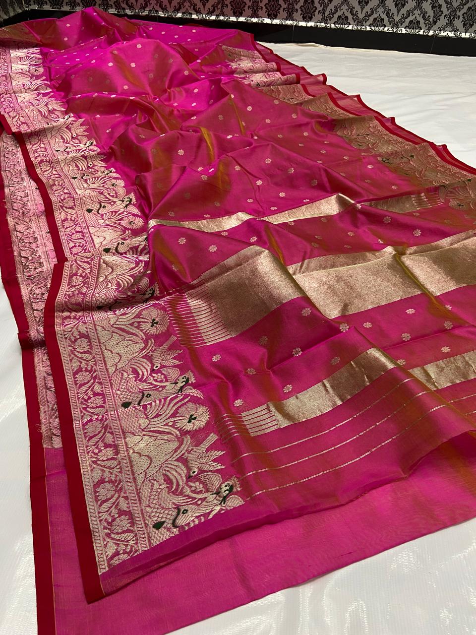 Hot Pink Chanderi Handloom Pattu Silk Meenakari Handwork Saree