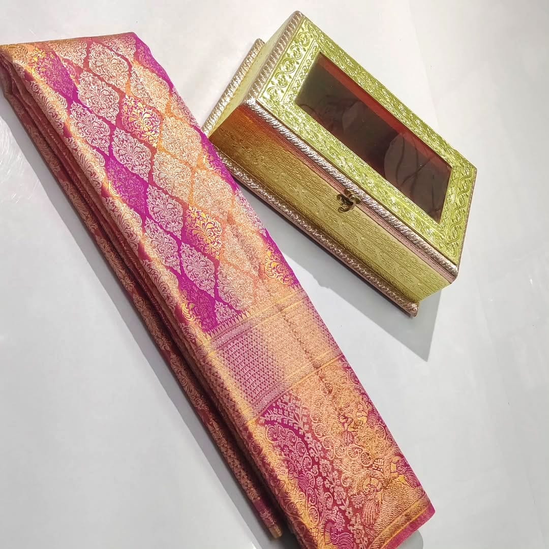 Gold and Hot Pink Kanchipuram Handloom Tissue Brocade Silk Saree