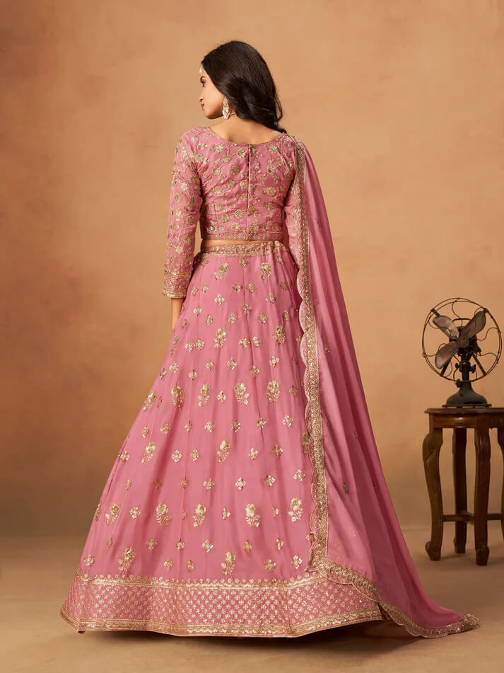 This light pink organza lehenga features delicate thread and sequins embroidery with a matching blouse and dupatta. Elegant and graceful, it’s a perfect choice for weddings, parties, and festive occasions.