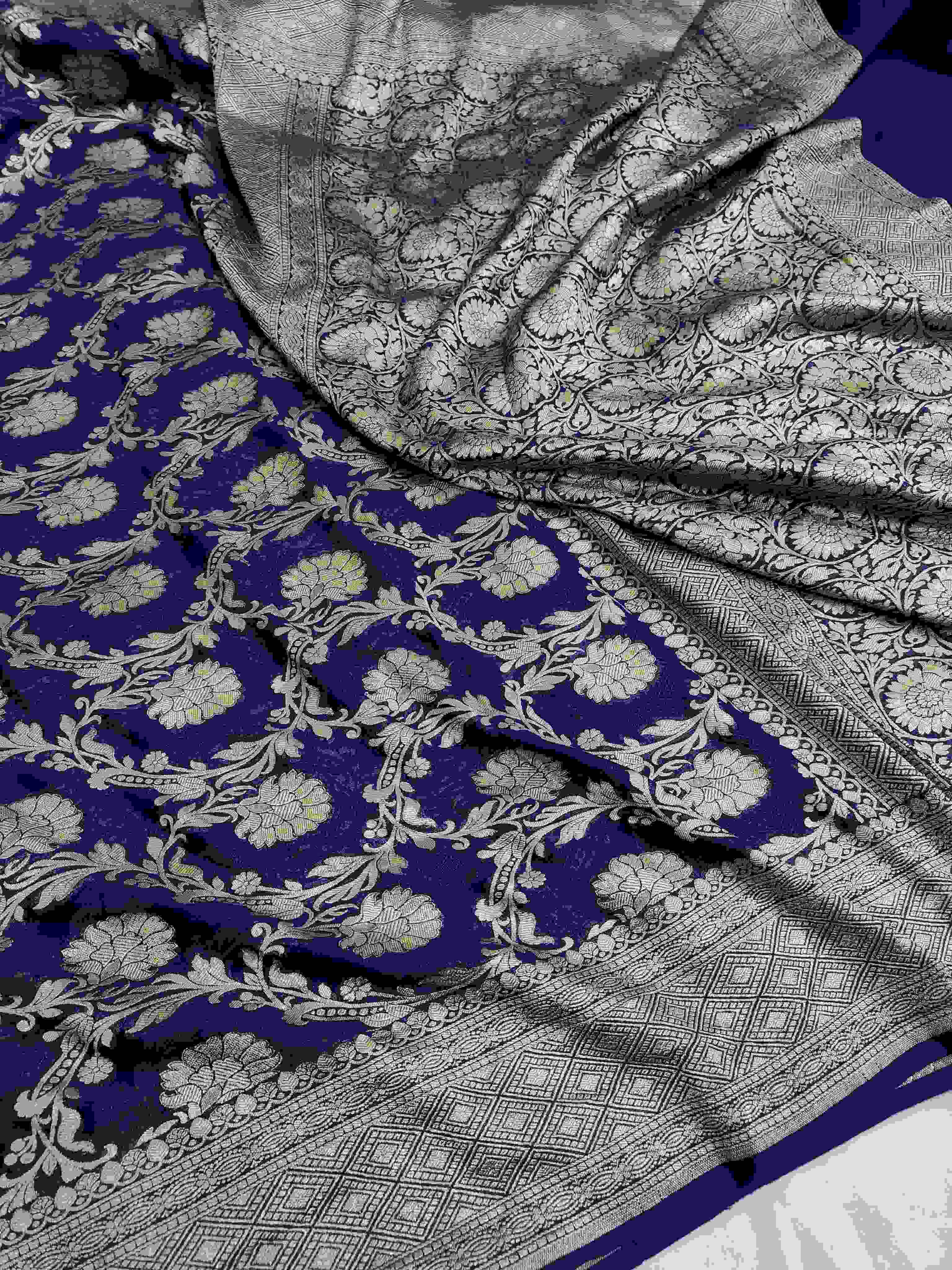 Midnight Blue Banarasi Handloom Water Zari Georgette Silk Saree
