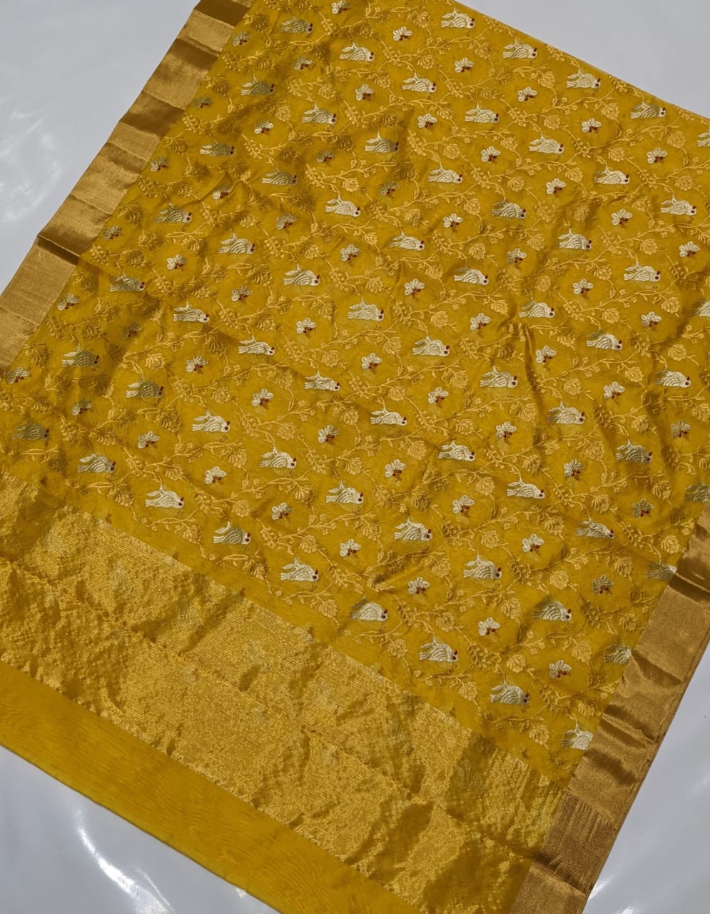 Mustard Yellow Chanderi Handloom Pattu Silk Meenakari Saree