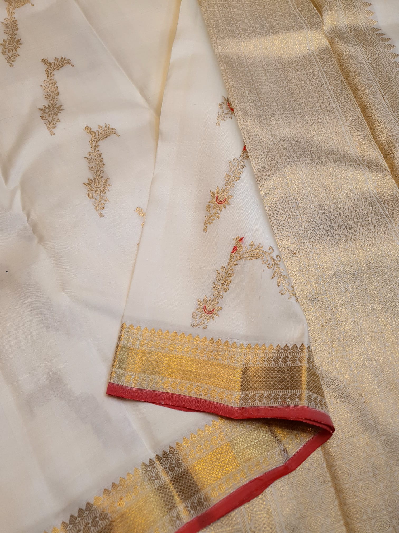 Off White Kanchipuram Handloom 3G Gold Pattu Silk Meenakari Saree