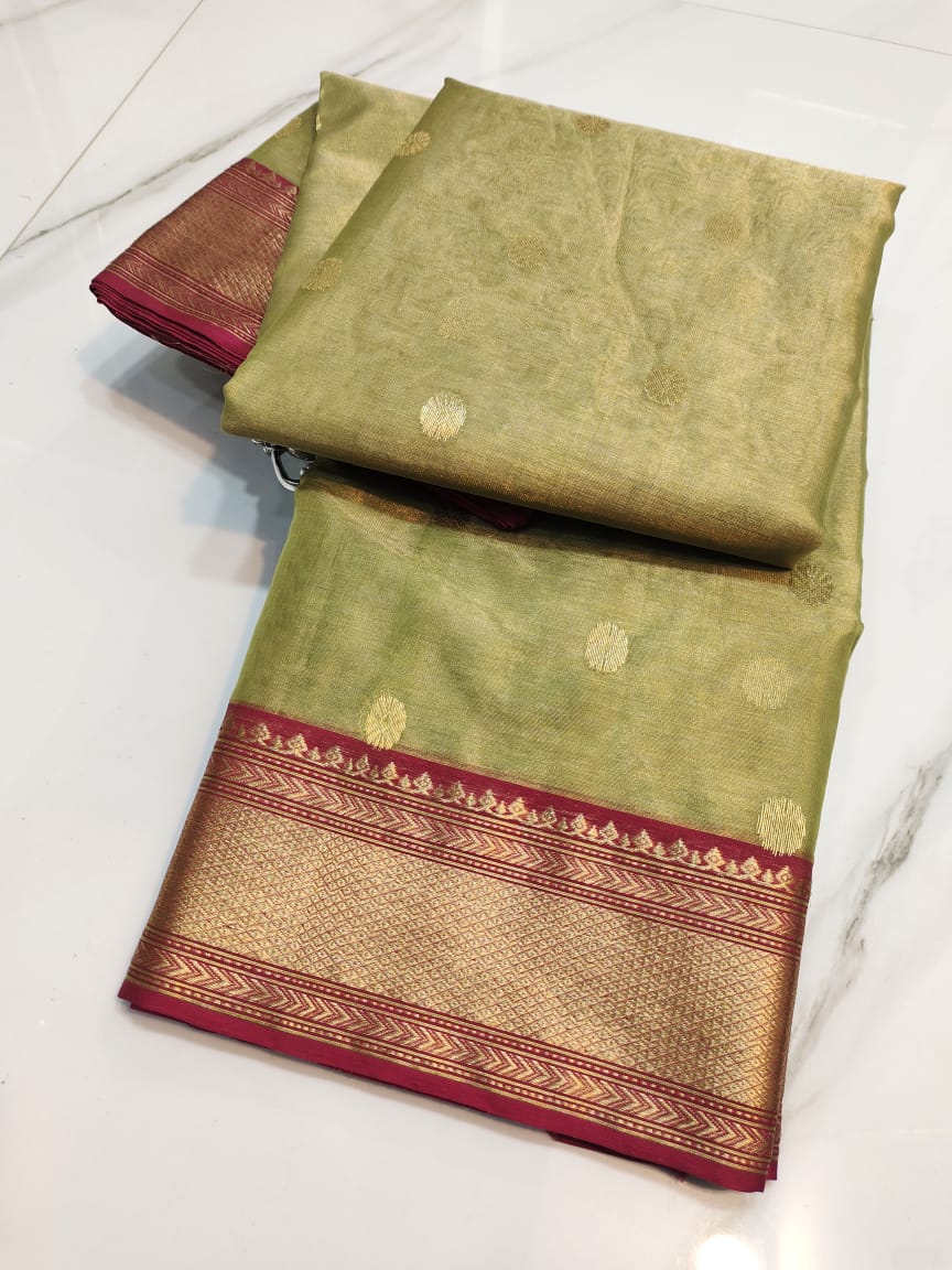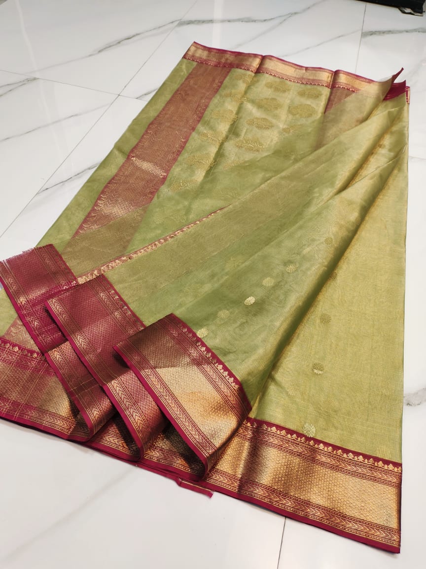 Pastel Olive Chanderi Handloom Katan Tissue Silk Meenakari Saree