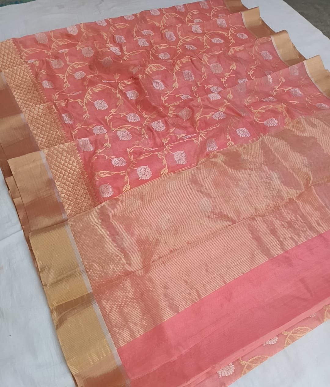 Peach Chanderi Handloom Pattu Silk Handwork Saree