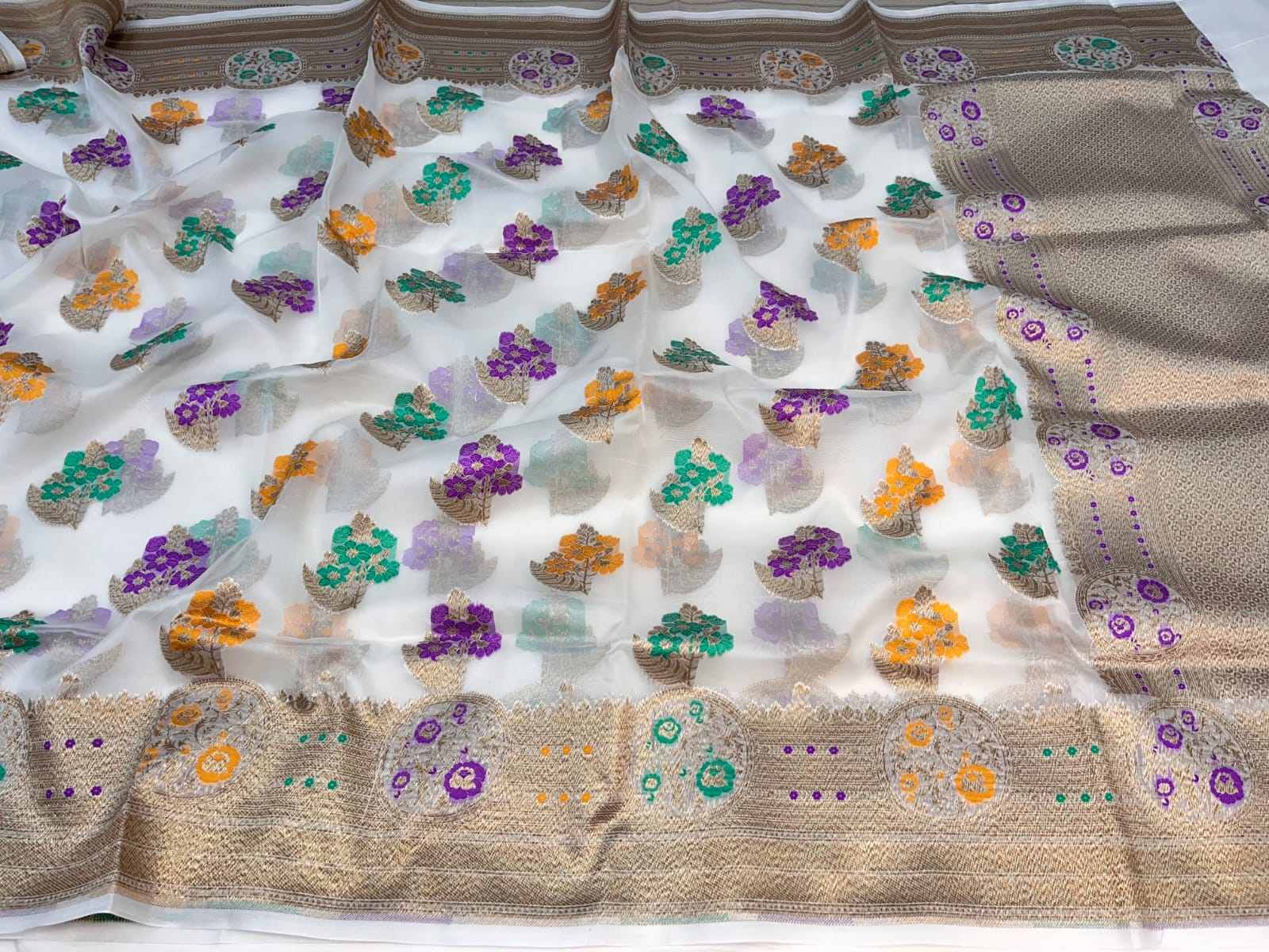 Pearl White Banarasi Handloom Kora Organza Silk Meenakari Saree