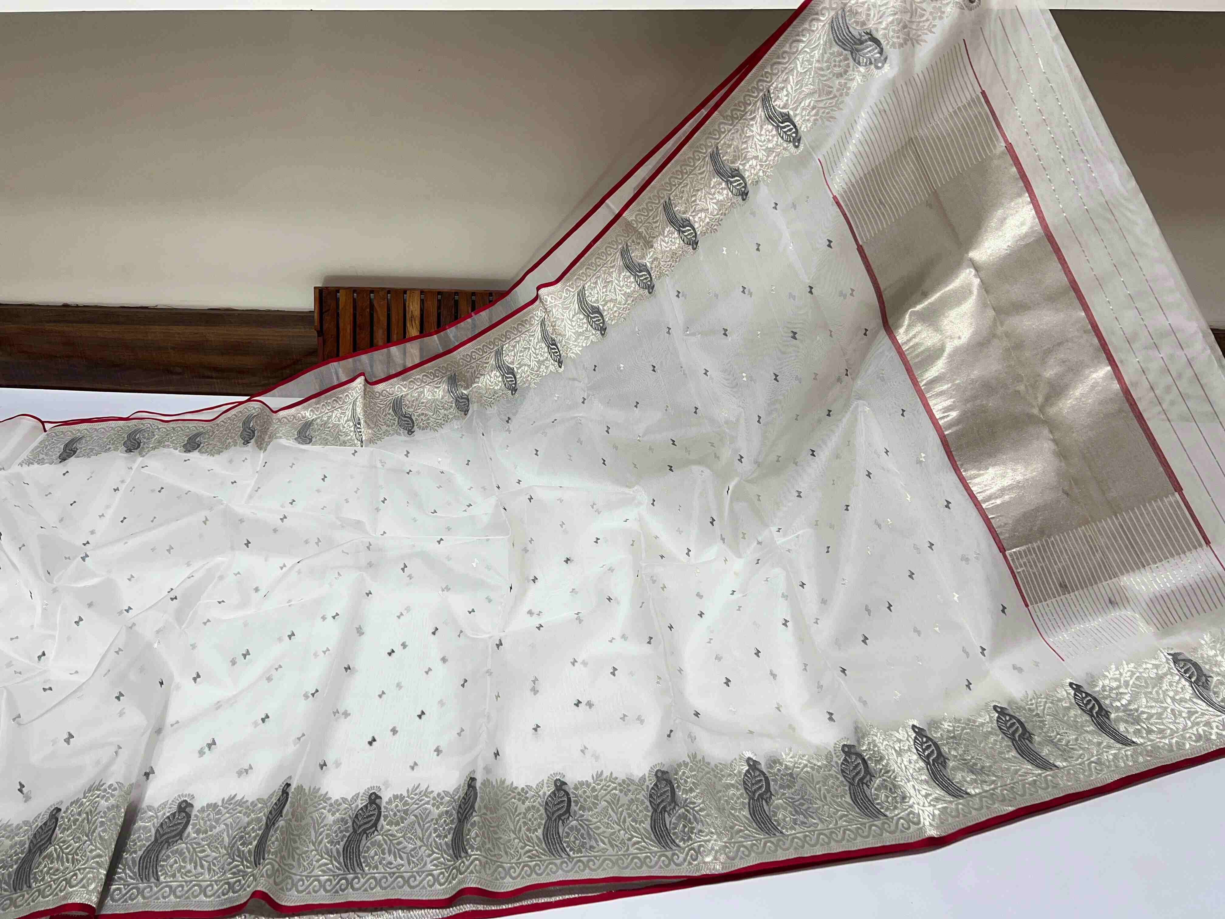 Pearl White Chanderi Handloom Katan Silk Saree