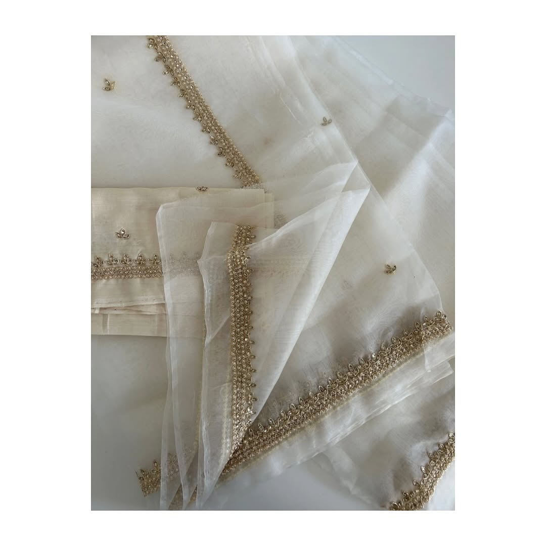Gold Hand Embroidered Tissue Organza Silk Saree