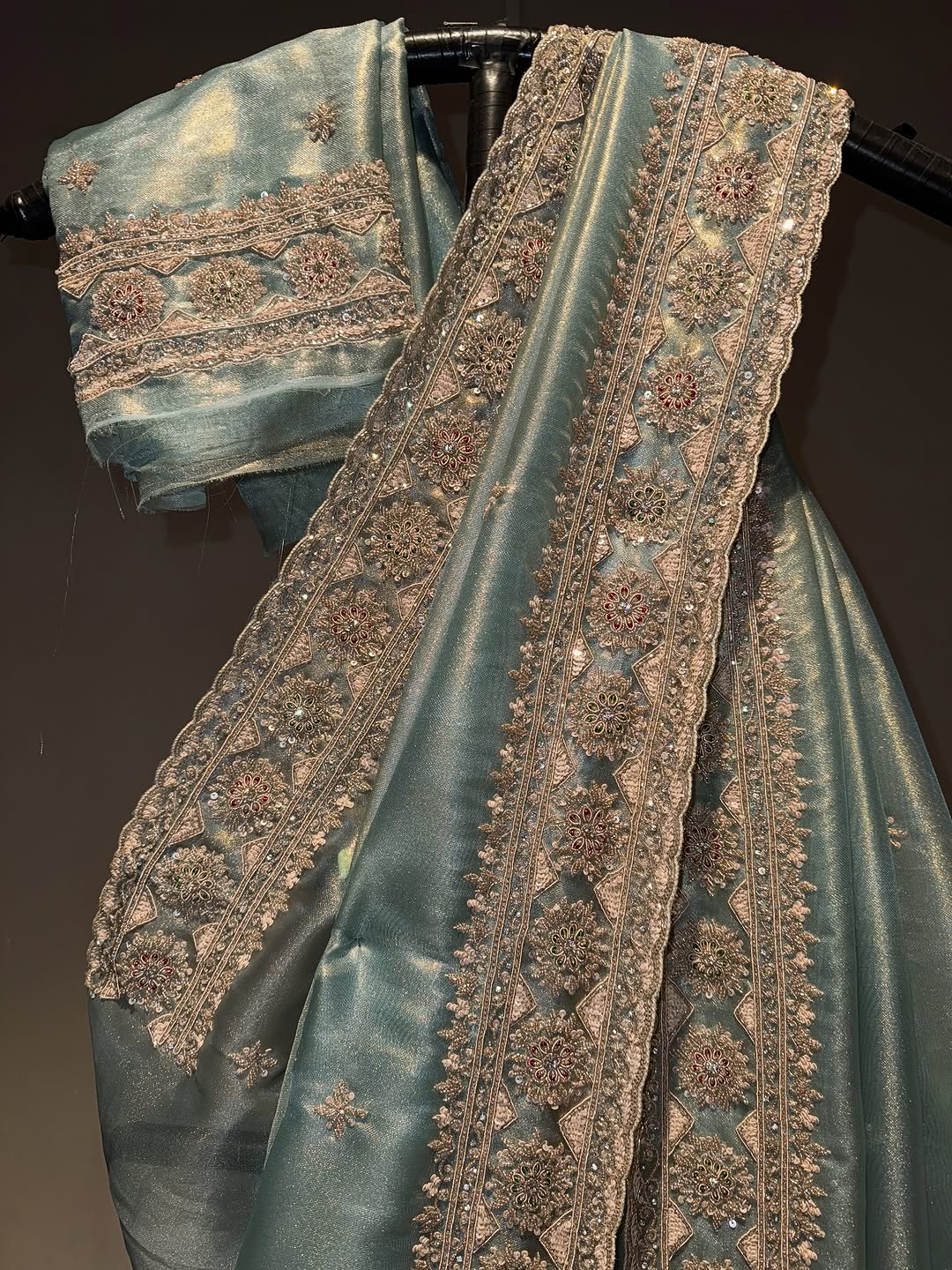 Powder Green Hand Embroidered Tissue Organza Silk Saree