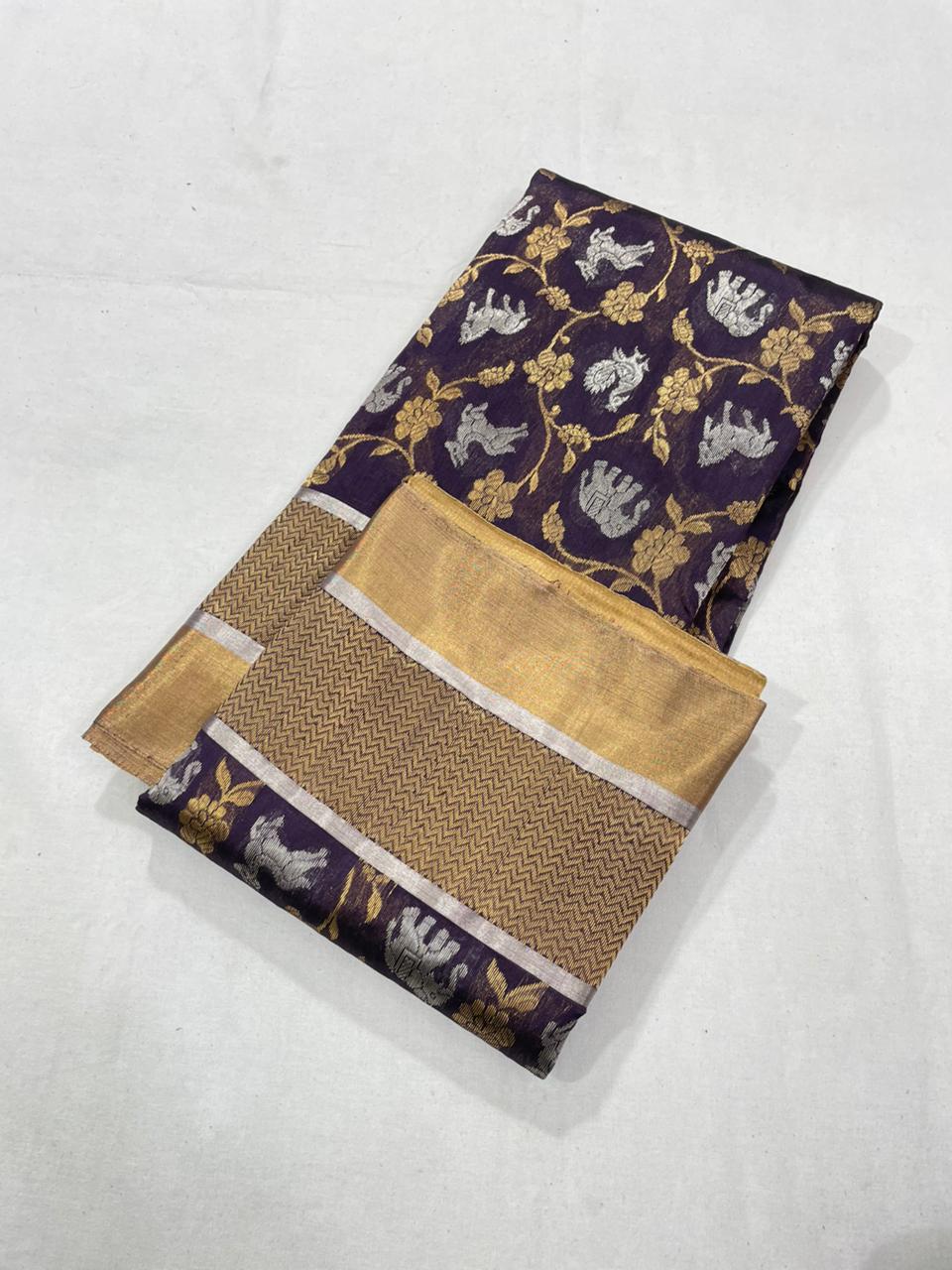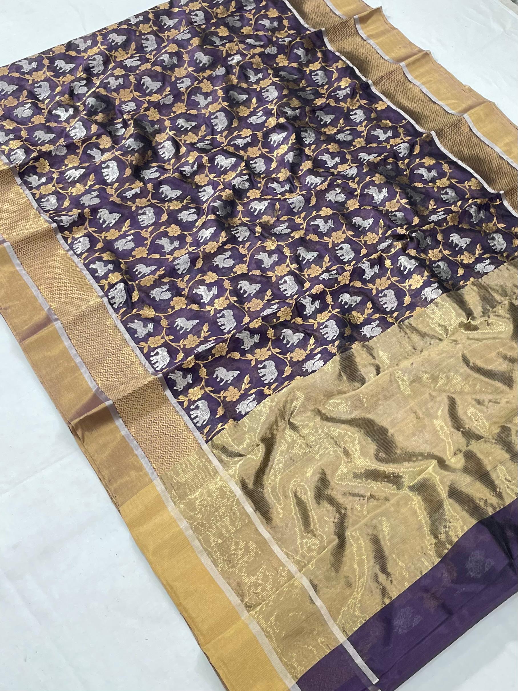 Purple Chanderi Handloom Pattu Silk Shikargah Handwork Saree