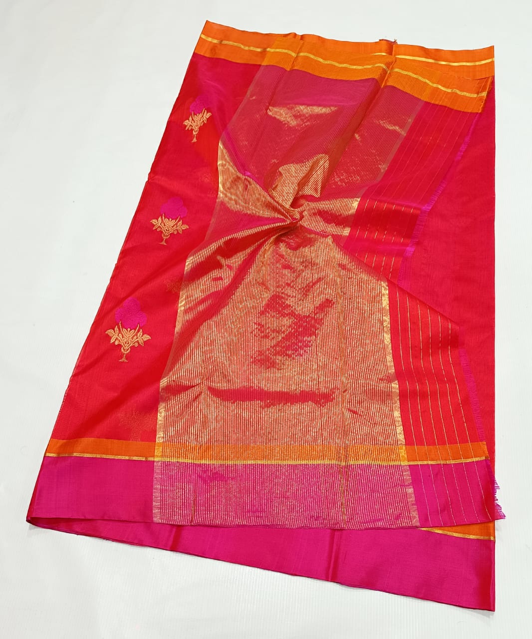 Red Chanderi Handloom Pattu Silk Eknal Buttas Saree