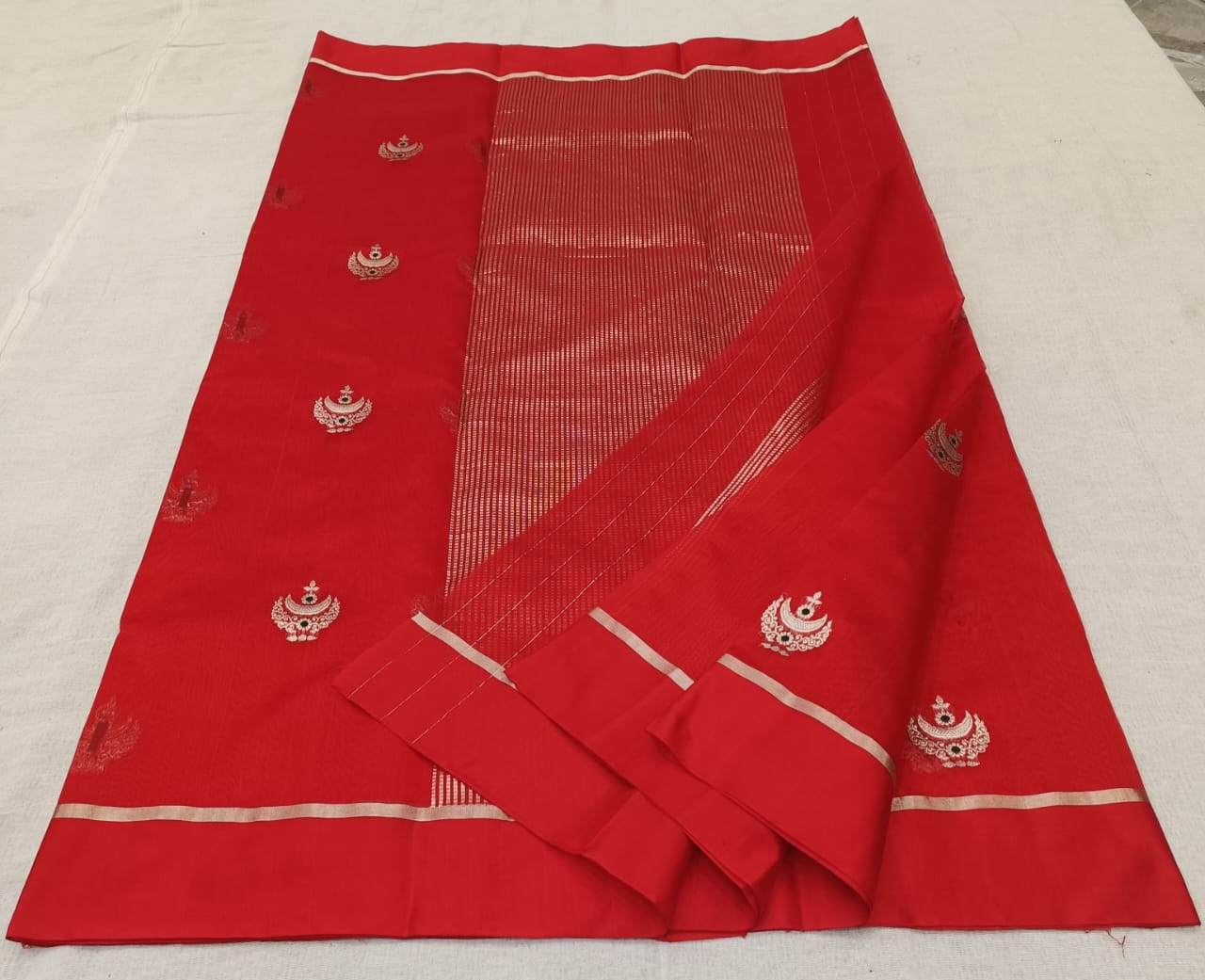 Red Chanderi Handloom Pattu Silk Eknal Buttas Saree