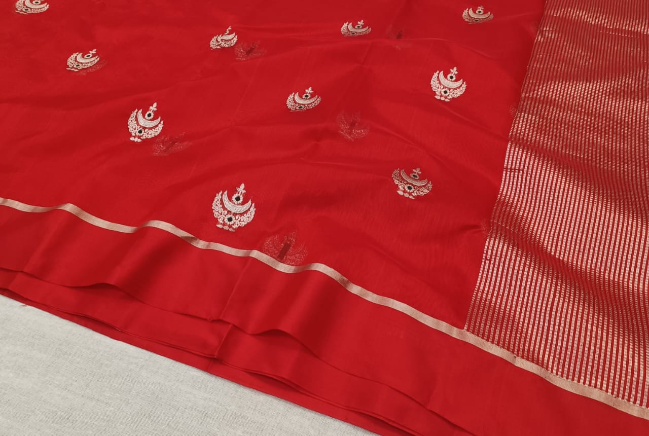 Red Chanderi Handloom Pattu Silk Eknal Buttas Meenakari Saree