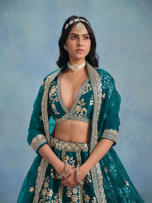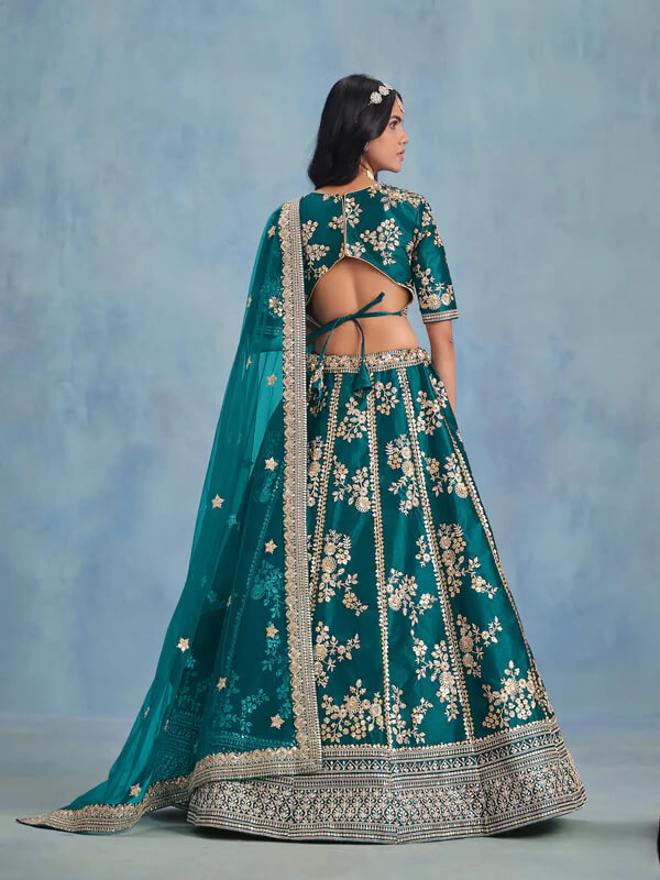 teal green lehenga choli, art silk designer lehenga, sequins thread embroidered lehenga, wedding teal lehenga, festive green lehenga, party wear art silk lehenga, elegant teal green lehenga
