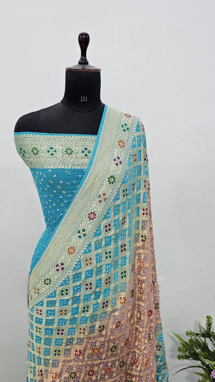 Turquoise Banarasi Handloom Gold Zari Bandhani Georgette Silk Saree