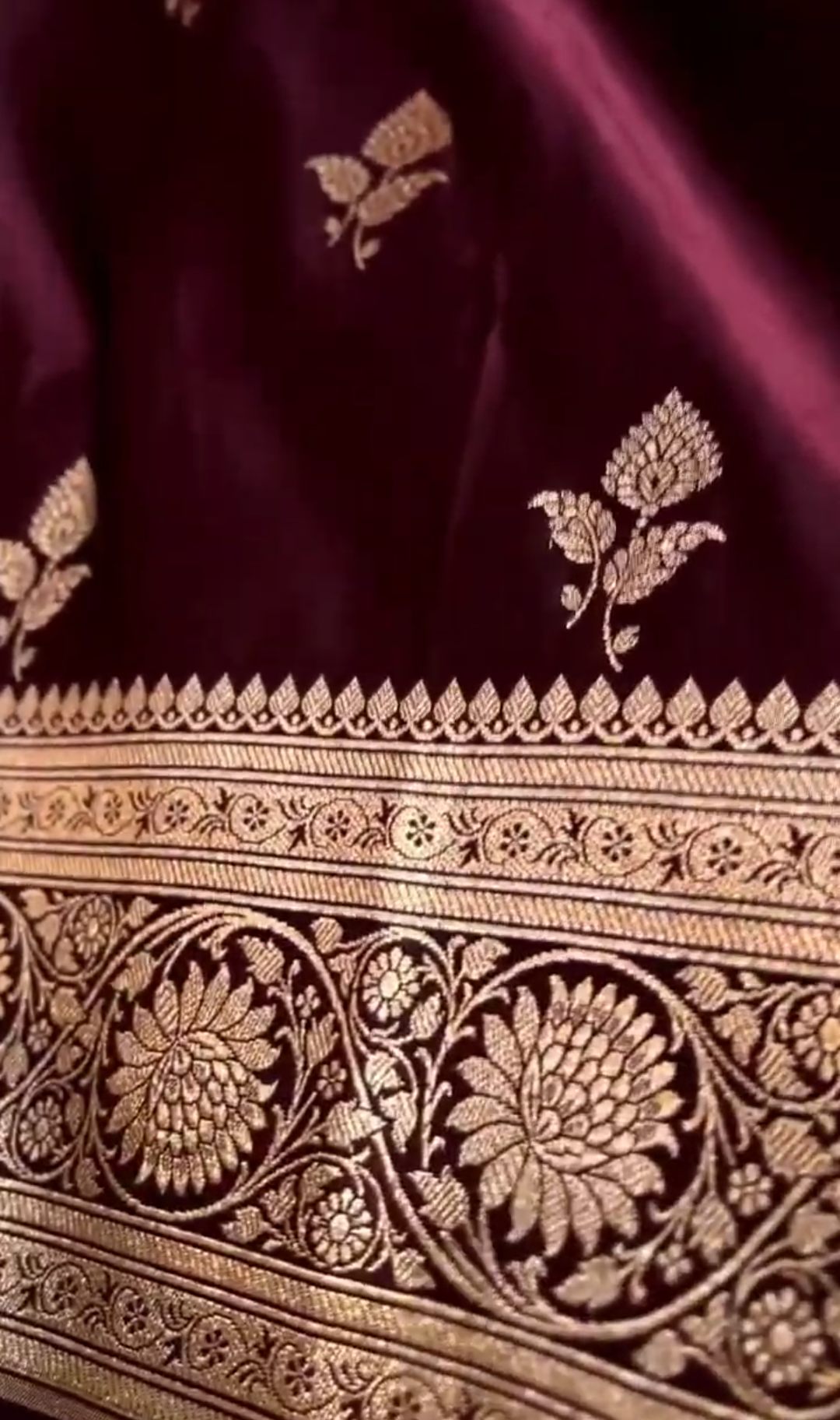 Wine Banarasi Satin Katan Silk Swarovski Jangla Saree