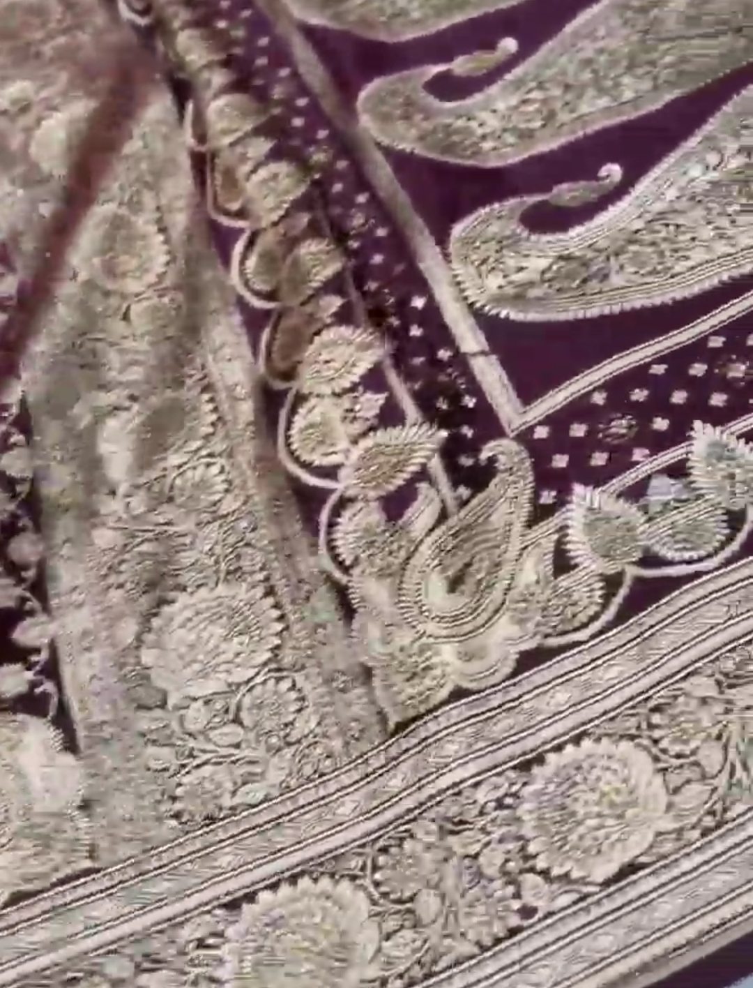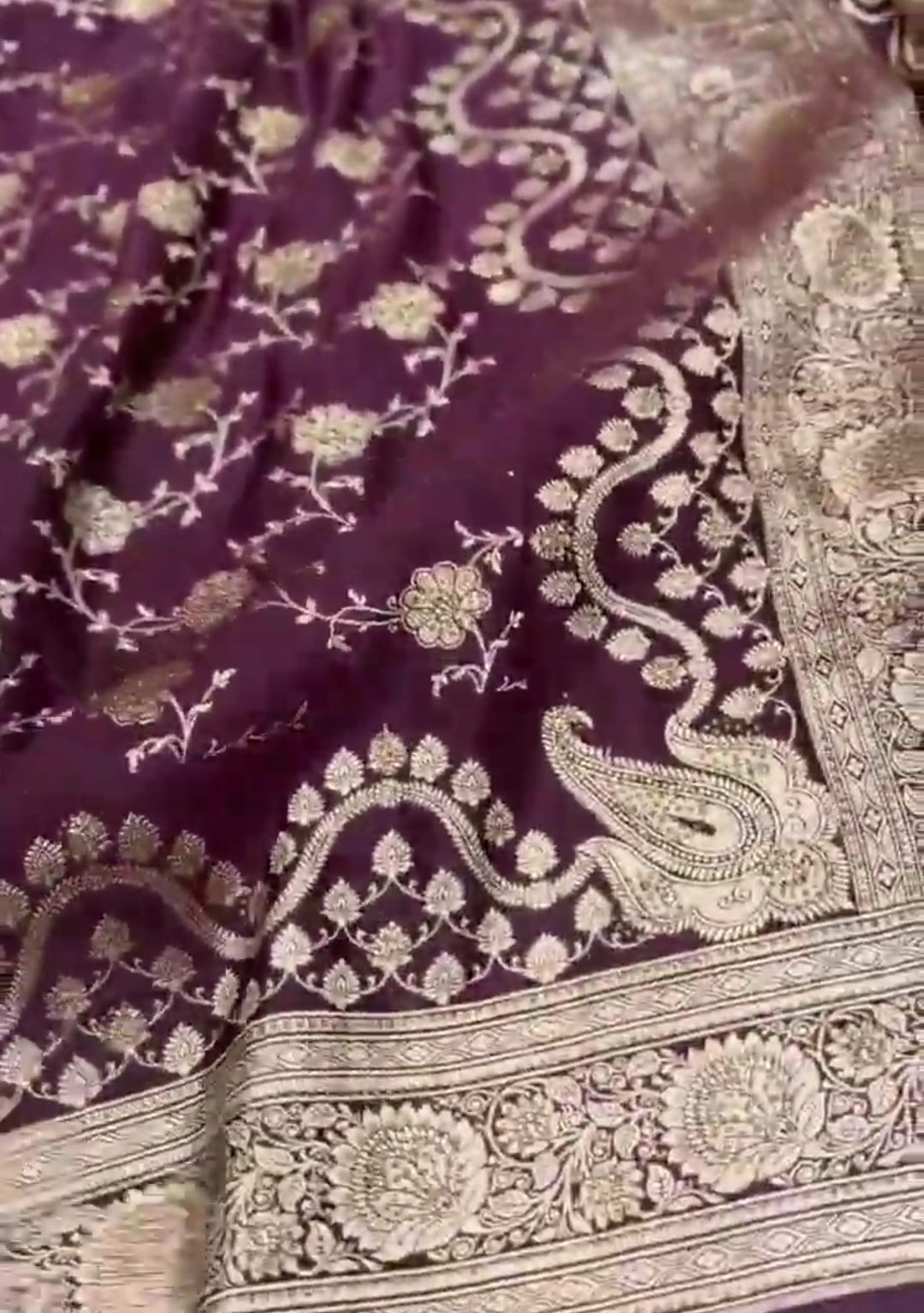Purple Banarasi Satin Katan Silk Swarovski Jangla Saree