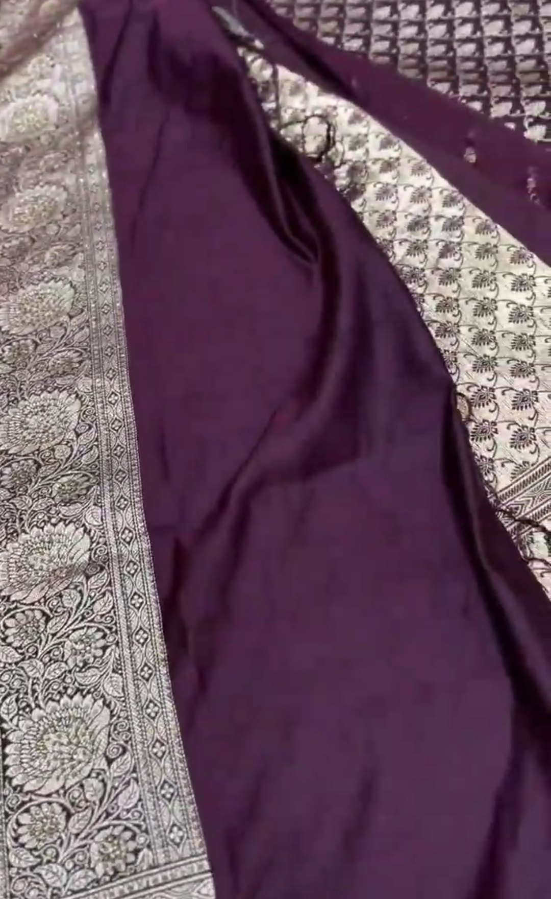 Wine Banarasi Satin Katan Silk Swarovski Jangla Saree